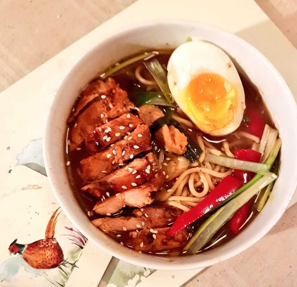 Serve up in a deep bowl adding the noodles, choi and broth first. Add additional spring onions for decorative purposes (chilli too if you wish) and then add the meat as if it sitting on top of the noodles and broth. Add the egg then too. Sprinkle over some sesame seeds if you have any kicking about.