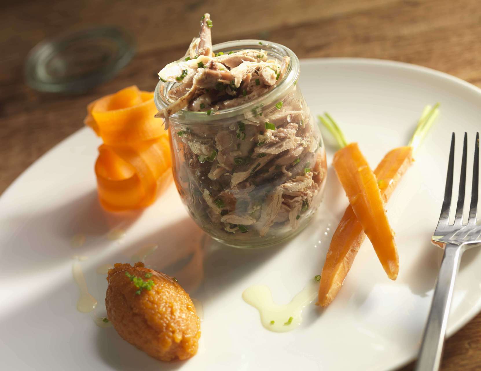 Pot the rabbit and serve with the carrots, 3 ways.